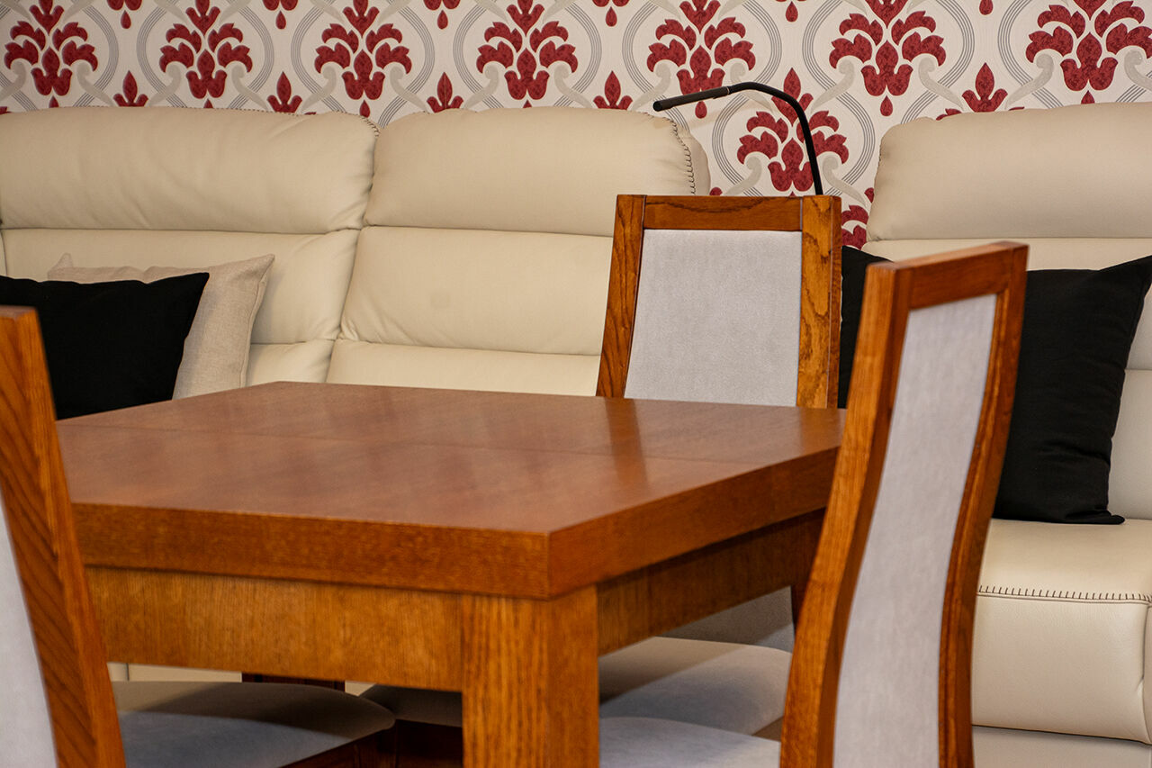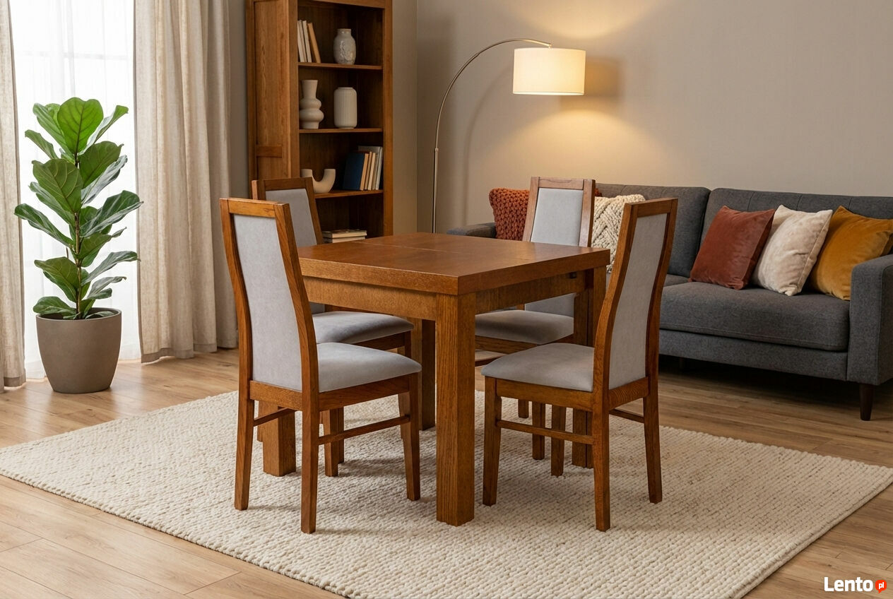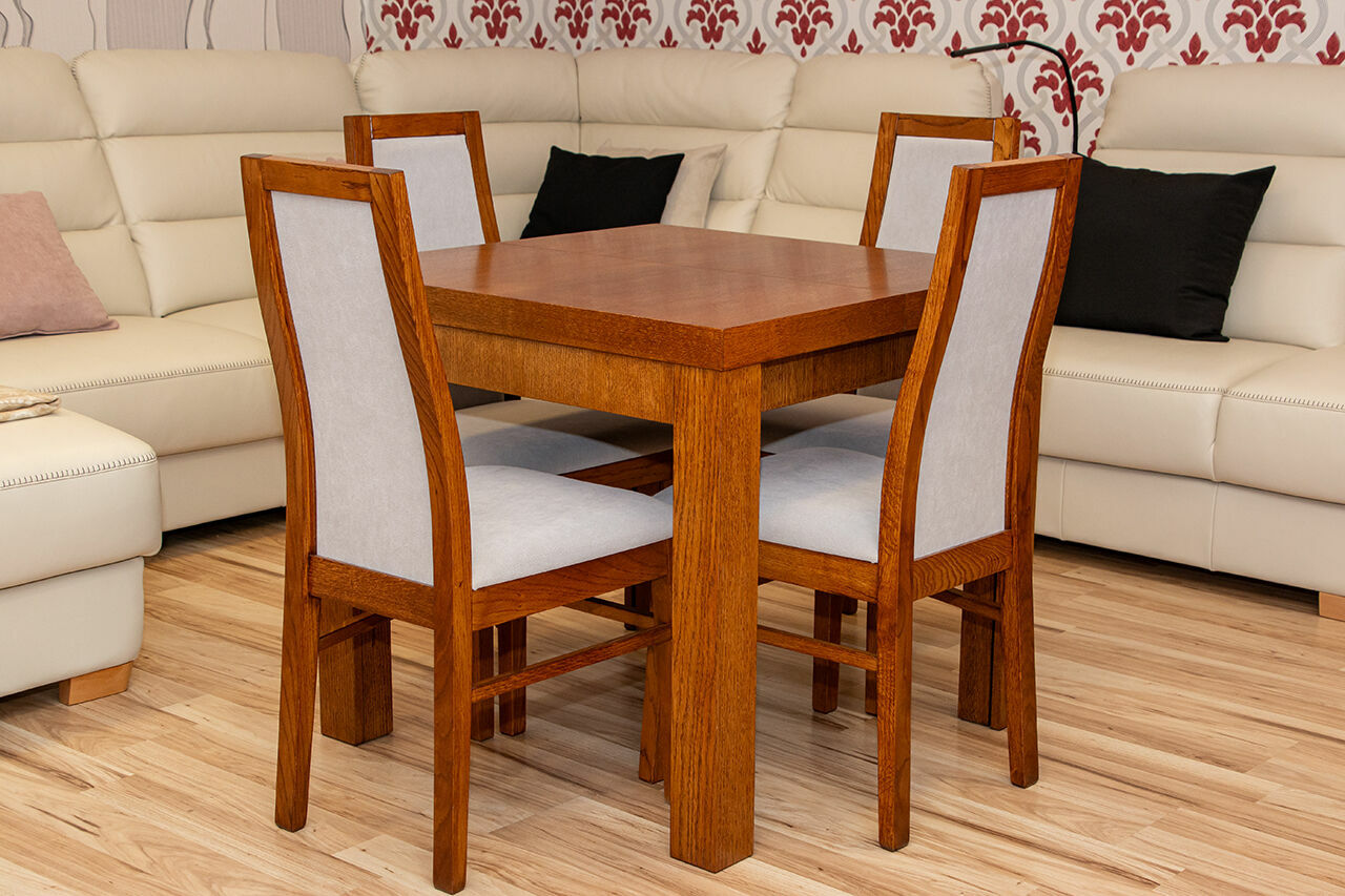 Stół "Skrzyniowo-Ramowy z nogą Rozkładaną" z okleiny dębowej + 4 krzesła (takie jak na zdjęciu)Wymiary: 85x85+2x55 (2 wkładki nie mieszczą się w stole)