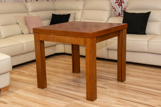 Stół "Skrzyniowo-Ramowy z nogą Rozkładaną" z okleiny dębowej + 4 krzesła (takie jak na zdjęciu) Wymiary: 85x85+2x55 ...
